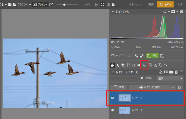 「エディター」モジュールではレイヤーを使用して特定の場所にだけ調整を加えることができます。