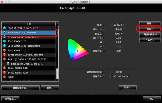 今調整した結果を選択した状態で検証に進むと、現在のディスプレイの状態を検証できます。