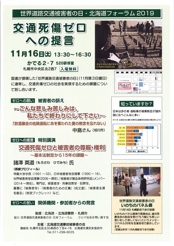 「世界道路交通被害者の日・北海道フォーラム」は国連が提唱した「世界道路交通被害者の日」に連帯して毎年開催されている行事だということです。
