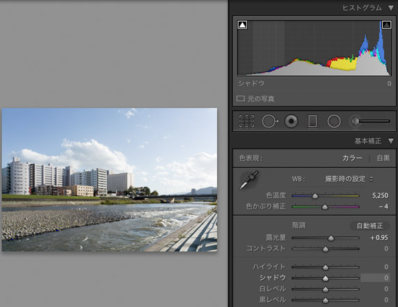 ここまでの調整で少し黒つぶれ気味になっている部分があれば、基本補正パネルに戻りシャドウのスライダーで黒つぶれを解消するよう調整します。