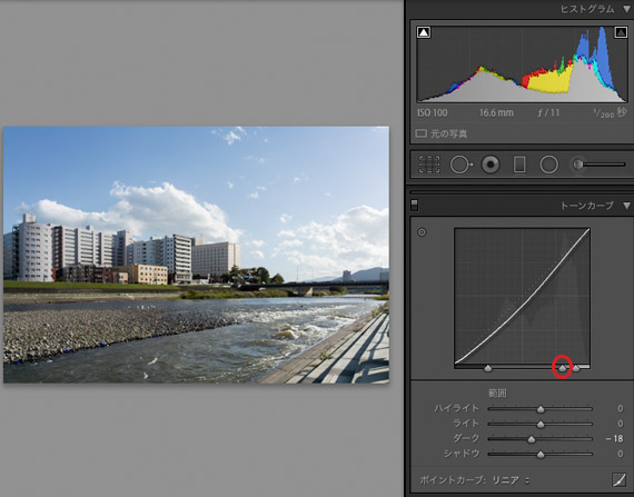 写真全体のコントラストが望ましい状態になるように、トーンカーブの中央下の印を右に動かして調整します。